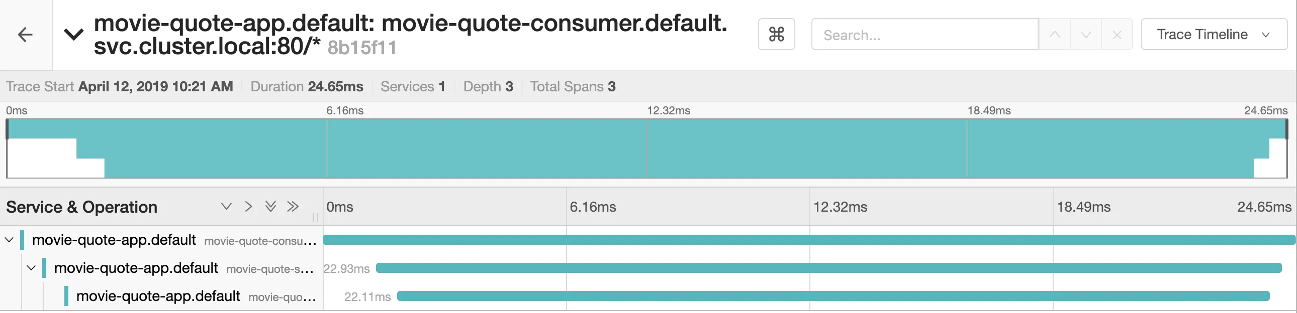 In my case, you can see that the movie-quote-consumer calls the movie-quote-service. But there you have it, you’re now able to see which calls are being made under the hood, and how long each call takes. This allows you to detect failures or performance issues.